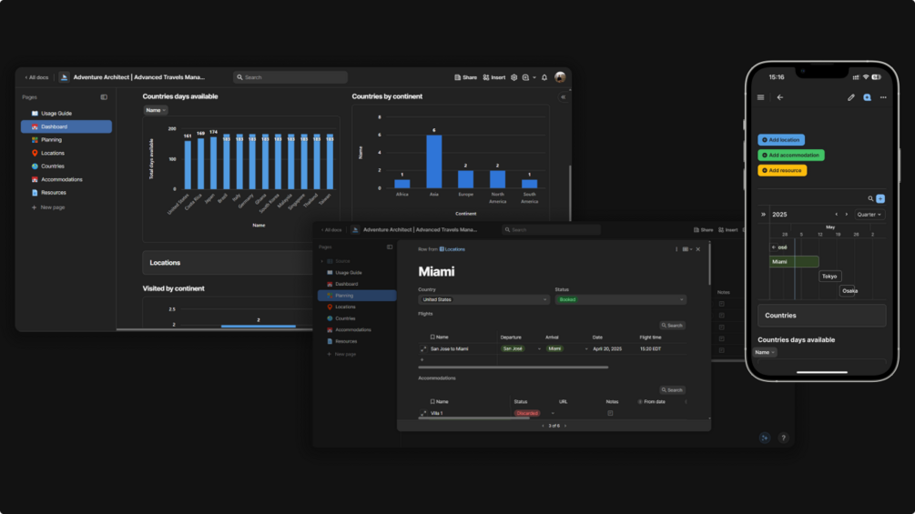 This system helps you manage travel prep checklists, flights, accommodations, activities, packing lists, and more—all in one place. It also automatically tracks your days spent in each country annually, helping you comply with the common 183-day residence rule applied worldwide.