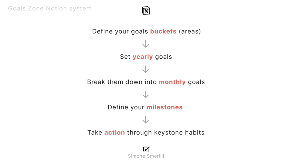 Break down your goals into Areas, lean into Yearly goals, set up Monthly targets, break the process down into Milestones, take action through habits and activities.