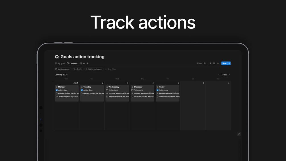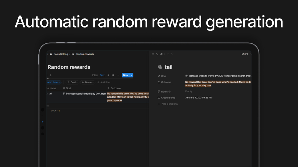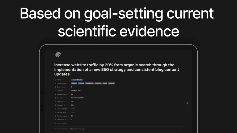 With this systematic goal-setting toolkit, you can define your priority goal for each cycle (12+ weeks), break it down into micro-actions, track your actions every day, and flip a digital coin for random reward generation.