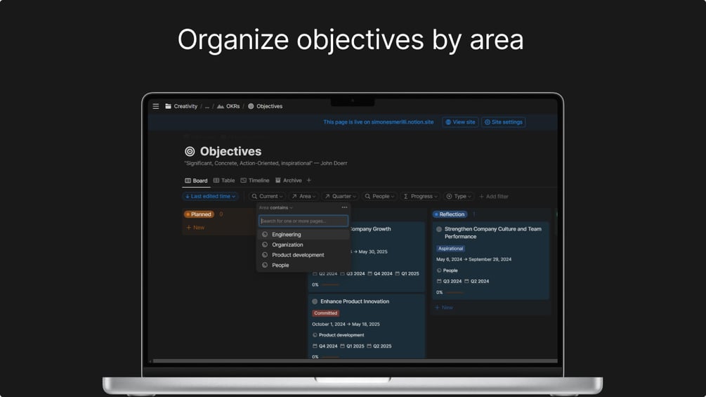 Adaptable and scalable based on your needs, this OKRs system is a centralized place to plan, manage, and track objectives and key results for your entire team. It is most suitable for smaller teams or startups (5-50 people).