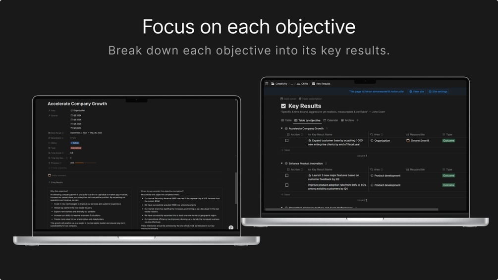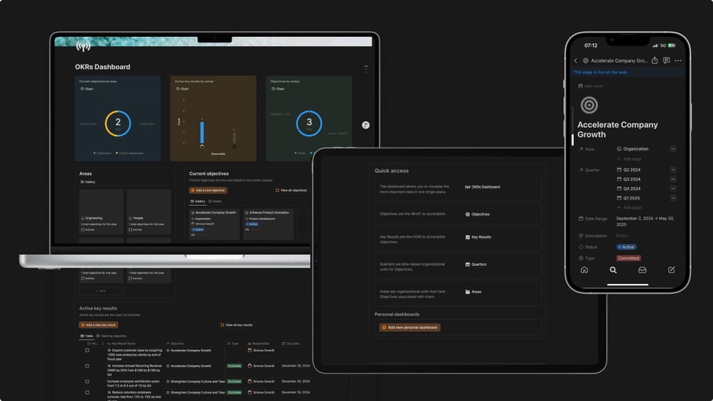 Adaptable and scalable based on your needs, this OKRs system is a centralized place to plan, manage, and track objectives and key results for your entire team. It is most suitable for smaller teams or startups (5-50 people).