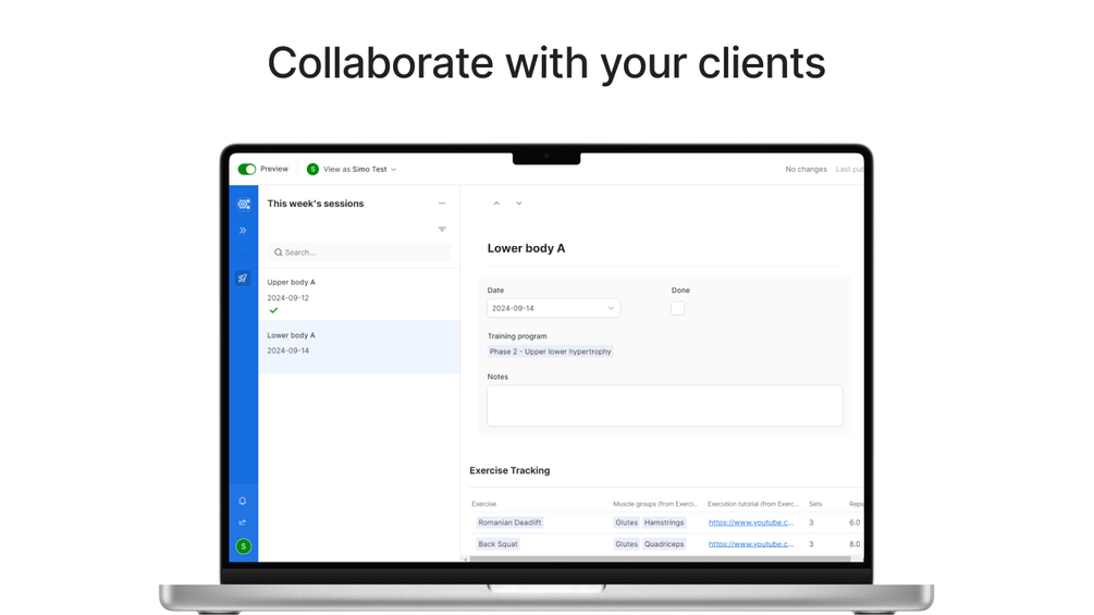 This template is for personal trainers to provide a custom and intuitive experience (also available on mobile) to their clients/athletes.