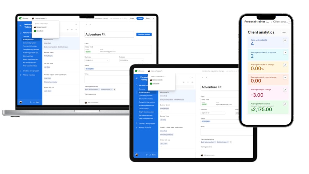 As a personal trainer, you can manage all the data in one centralized Airtable base. Each client will only have access to their data through the dedicated Interface (optional). This creates an app-like experience for you and your athletes while maintaining the customizability of a no-code tool that is Airtable.