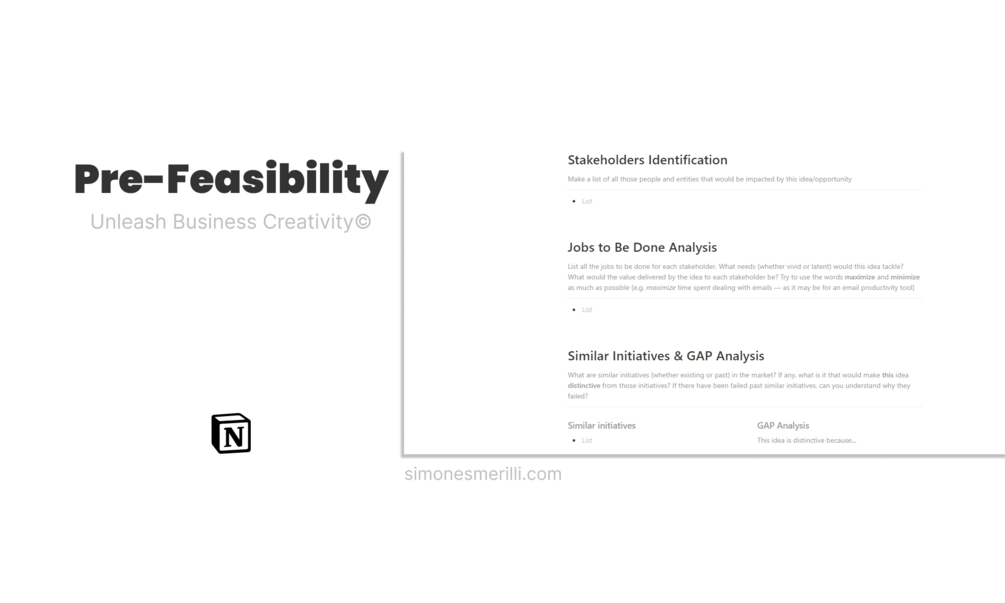 This Notion template is a system. It is not a full guide on how to build a business. Building businesses, especially after the launch phase, is something which requires solid knowledge, experience, and time. The Unleash Business Creativity system provides a blueprint for lean start up development and testing, completely ideated and implemented in Notion. The aim of this model is to build things from the ground up, until pitching your initiative to potential investors. This system is based on real-world feedback and solid data gathering, in order to provide a clear roadmap to the establishment of a start up. is composed of 5 main actionable phases: