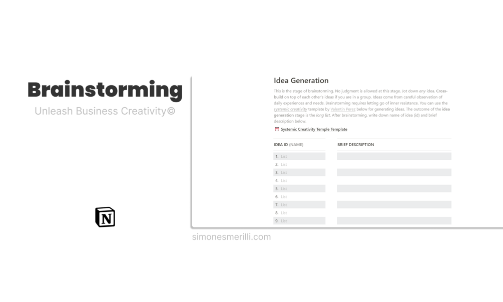 A full Notion template containing the Unleash Business Creativity lean system of startup development: from brainstorming to lean testing.